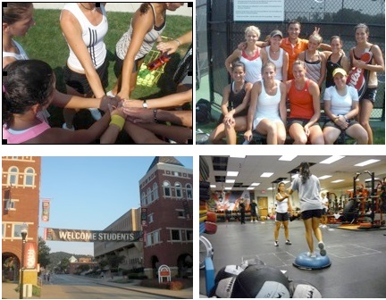 In der Tennis-Hauptsaison (= spring season) trainieren wir ungefähr 20 Stunden in der Woche plus den Wettkämpfen am Wochenende. Morgens vor der Uni haben wir Fitnesstraining, d.h. Kondition und Krafttraining, nachmittags dann das Tennistraining. Wir trainieren immer 6 Tage in der Woche. Meistens ist es so, dass am Anfang der Woche das Training intensiver ist. Je näher das Wochenende und die Matches kommen, desto geringer wird die Intensität des Trainings. Schließlich müssen wir genügend Energie für die Spiele haben. Nach dem Wochenende haben wir meistens 1 bis 2 Tage trainingsfrei - je nachdem wie müde wir sind. Die Hauptsaison ist für die Tennisspieler eine Saison wo man als Team auftritt. Das heißt der Fokus ist auf das ganze Team gerichtet. Wir spielen gegen andere Hochschulen. Dabei spielen immer die 6 Stärksten (Zu Beginn der Saison wird der „Roster“ (Spielbesetzung/Platzierung) ausgespielt, also wer an Nummer 1 spielt und wer an 2 und so weiter). An einem Spieltag fangen wir immer mit den Doppeln an – ein verlängerter Satz bis 8 (bei dem Spielstand 7:7, spielt man bis 9. Und bei 8:8 spielt man einen Tiebreak.) Anschließend kommen die Einzel, die ganz normal in 2 Gewinnsätzen ausgespielt werden. In der Nebensaison (= fall season) trainieren wir nur 8 Stunden die Woche. Das ist relativ wenig, wenn man sich an die Hauptsaison einmal gewöhnt hat. Viele von uns gehen öfters zusätzlich noch ein bisschen trainieren. Die 8 Stunden beinhalten Fitnesstraining wie auch Tennistraining. Die Anzahl der Trainingseinheiten wechselt dabei immer wieder. Dieses Jahr hatten wir auch eine Stunde Psychologie, wo wir als Team mit einem Sportpsychologen an unserer Mentalität in Matches wie auch an unserem Verhalten auf dem Tennisplatz gearbeitet haben. Es war eine sehr interessante Erfahrung, denn heutzutage trainiert man sehr viel physisch, macht aber relativ wenig für die Psyche, die oft den Ausschlag über Sieg oder Niederlage gibt. Die Nebensaison legt mehr Wert auf einzelne Spieler. In dieser Zeit spielen wir Turniere in denen es auch vorkommt, dass wir gegen unsere Teammitspieler spielen müssen.